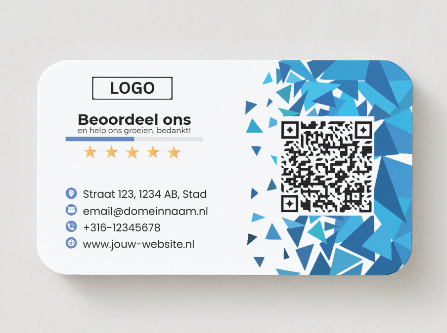 Versterk je online reputatie met onze op maat gemaakte reviewkaart! Deze gebruiksvriendelijke kaart bevat een personaliseerbare QR-code die klanten direct naar jouw Google Bedrijf Profiel leidt. Verzamel snel en eenvoudig waardevolle klantreviews en bouw meer vertrouwen op bij potentiële klanten.