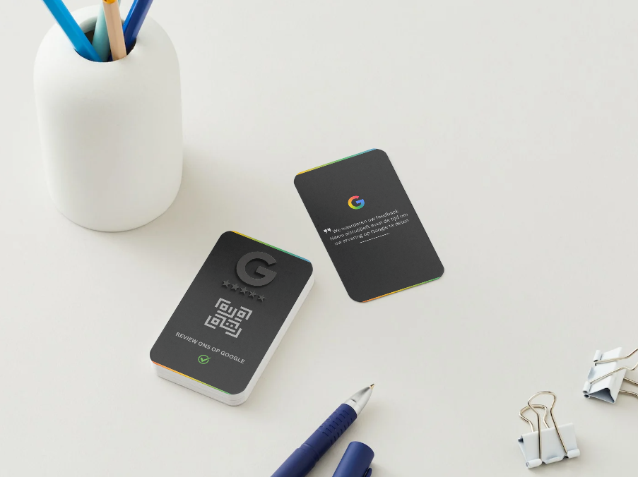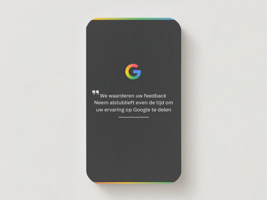 Versterk je online reputatie met onze op maat gemaakte reviewkaart! Deze gebruiksvriendelijke kaart bevat een personaliseerbare QR-code die klanten direct naar jouw Google Bedrijf Profiel leidt. Verzamel snel en eenvoudig waardevolle klantreviews en bouw meer vertrouwen op bij potentiële klanten.