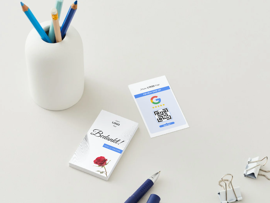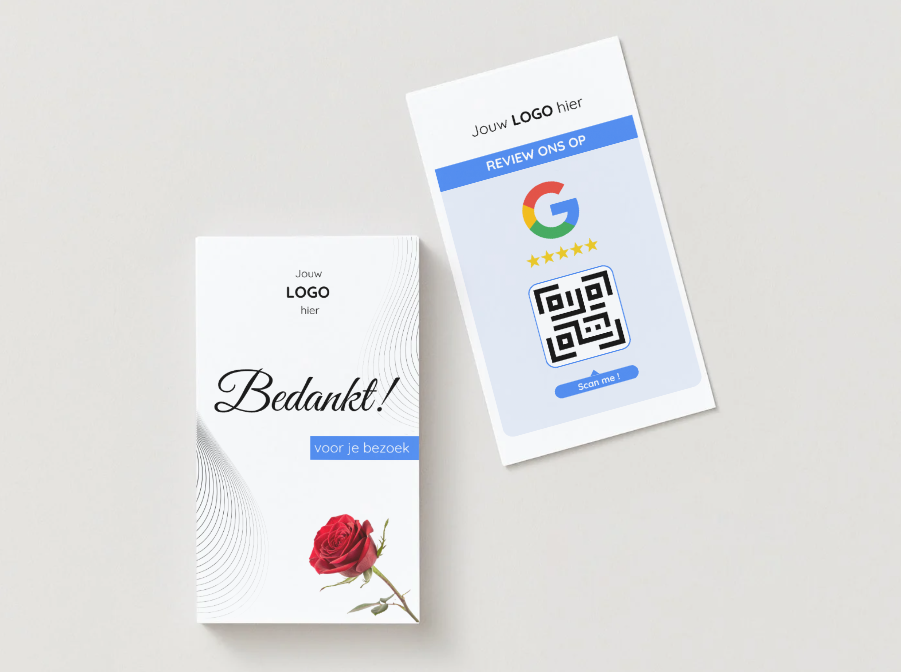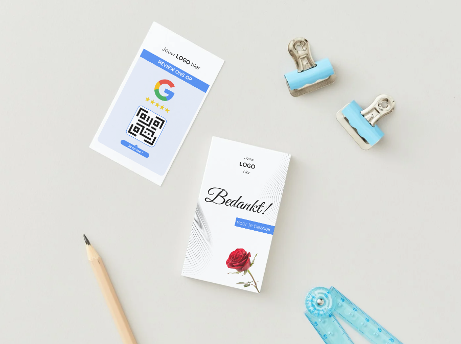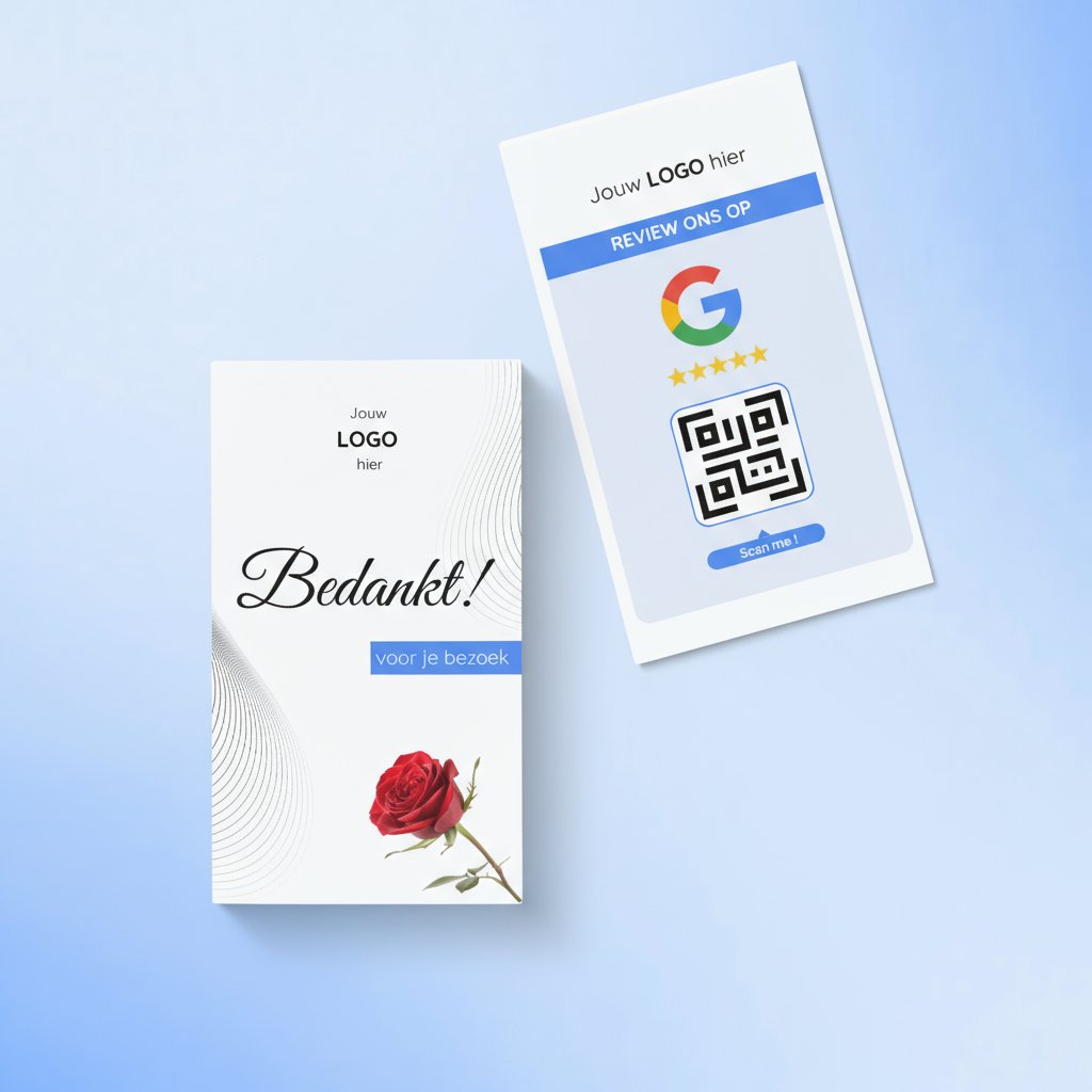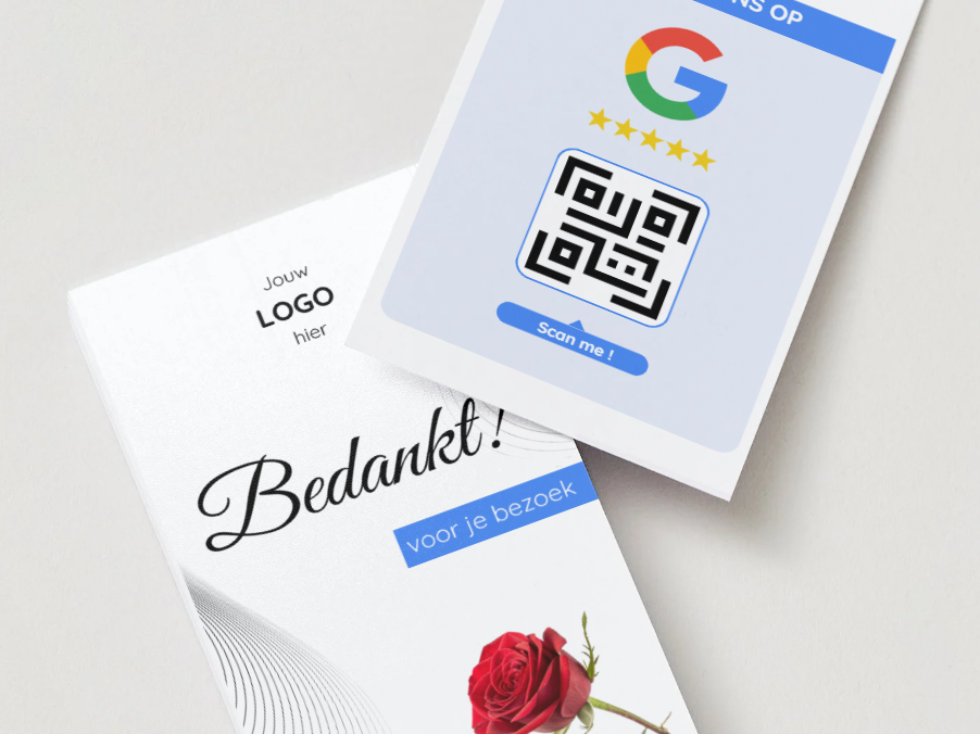 • Wij ontwerpen jouw visitekaart en reviewkaart voor €39,95, inclusief onbeperkte revisies.